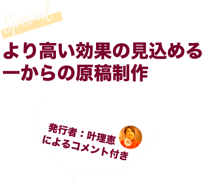 より高い効果の見込める一からの原稿制作を、全て発行者である叶理恵(かのうりえ)による「コメント」付きで承っております。